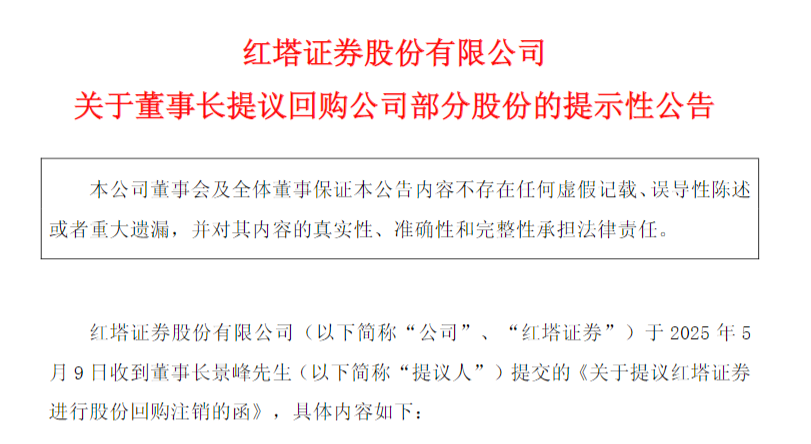 5月9日,红塔证券(601236)公告称,董事长景峰提交了《关于提议红塔证券进行股份回购注销的函》,提议以自有资金回购公司部分股份。